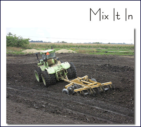 The mixing should be accomplished by discing with an offset type self-cleaning disc sufficiently weighted to produce full mixing to a depth of six inches, or other approved mixing method. Multiple passes are necessary to achieve a uniform mixture. Each six-inch layer, typically transferred from the mixing pad to the lake by use of a self loading scraper, shall be spread on the subgrade of the previous layer in preparation for compaction.